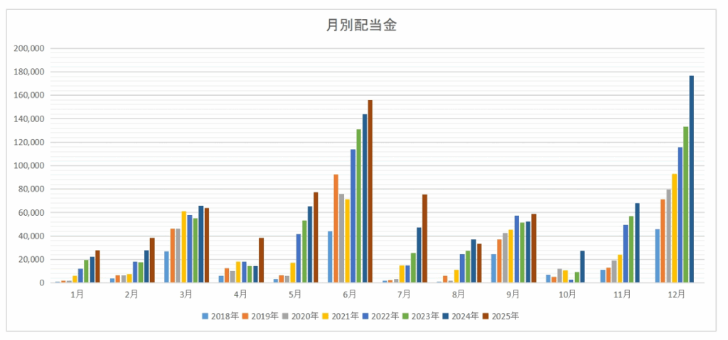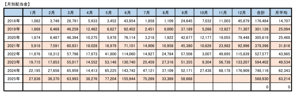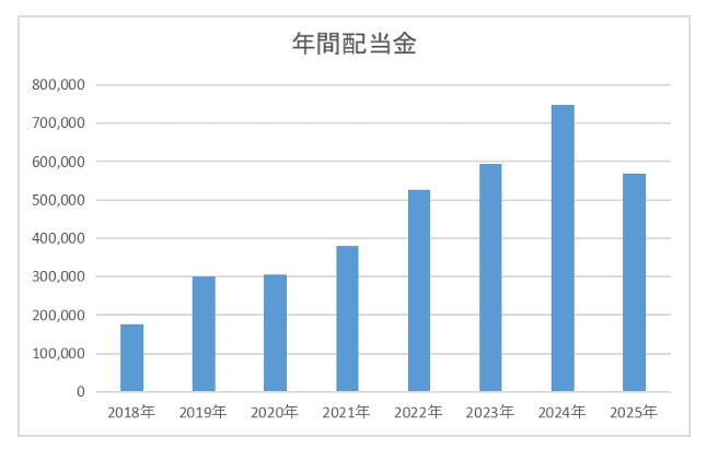 年間配当金は、着実に増えています。2025年はまだ途中です。